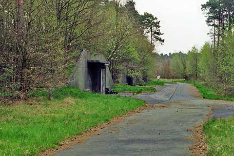 Von der Wache führt die Straße Richtung Norden. Sie wies auf 200 m Strecke eine größere Breite auf. Dieser Teil war als Sammelausfahrt deklariert. Darauf konnten sich mehrere LKW aufreihen, die als Kolonne das Objekt verlassen sollten. Nach rund 150 m erreichte man den Packmittelschuppen. Hier konnten auf 60 m² Fläche Verpackungsmaterialien aufbewahrt werden. An der rechten Seite des Schuppens befand sich ein separater Raum mit knapp 40 m². Darin sind die Gabelhubwagen abgestellt worden, entsprechend der ZDv müßten es 10 Stück gewesen sein. Einige Meter weiter gab es eine Löschwasserzisterne. Laut Lageplan hat sie lediglich 100 m³ aufgenommen, damit gehört sie zu den kleineren Exemplaren. Ab hier zweigen die Lagerstraßen nach rechts ab, an denen die Munitionsbunker aufgereiht stehen.
