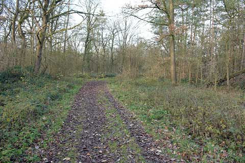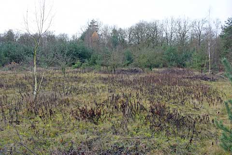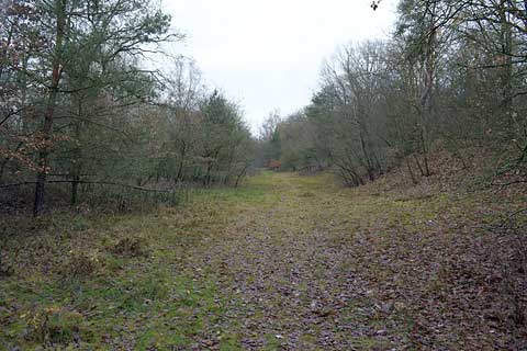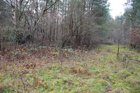 Links des rechts noch zu erahnenden Weges standen früher die Bauten des Schießstandes: Aufenthaltsraum, Lagerschuppen und Latrine.