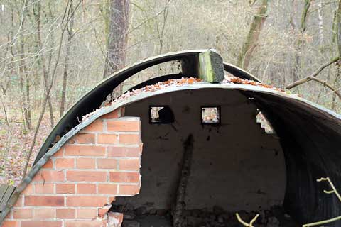 Die Mehrzahl der Nissenhütten weisen heute Beschädigungen auf. Hier fehlt die Hälfte des zweiten Daches.