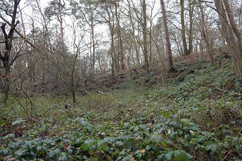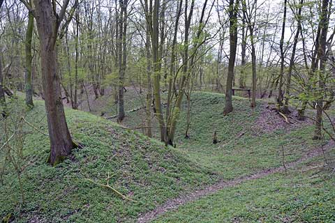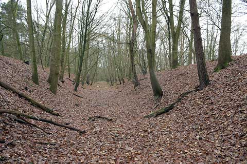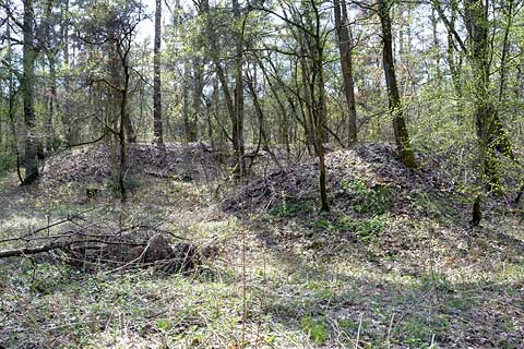 Die Wälle zur seitlichen Trennung der drei Gewehr-Schießstände sind weiterhin gut zu erkennen.